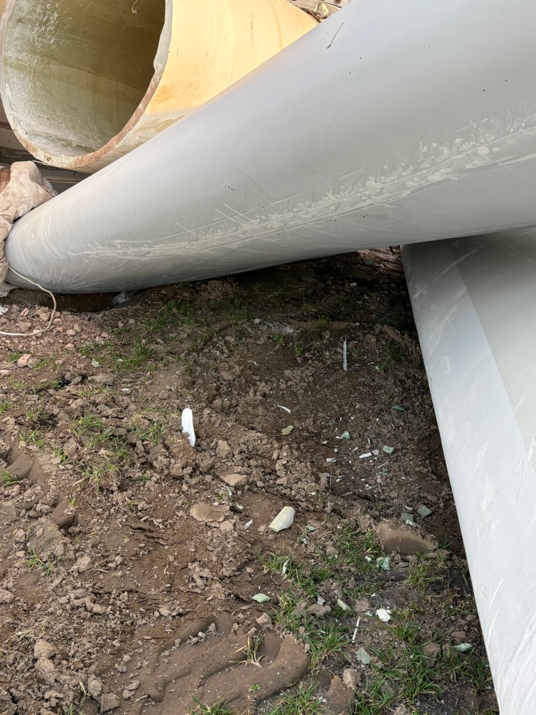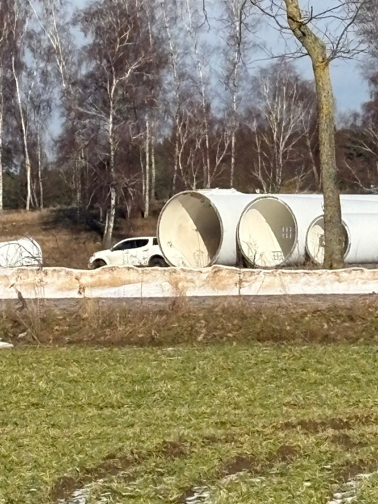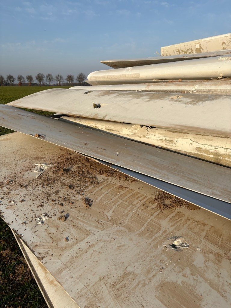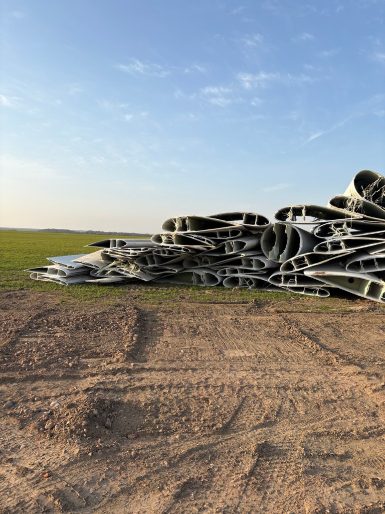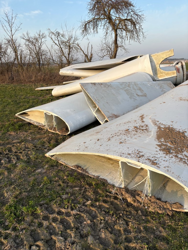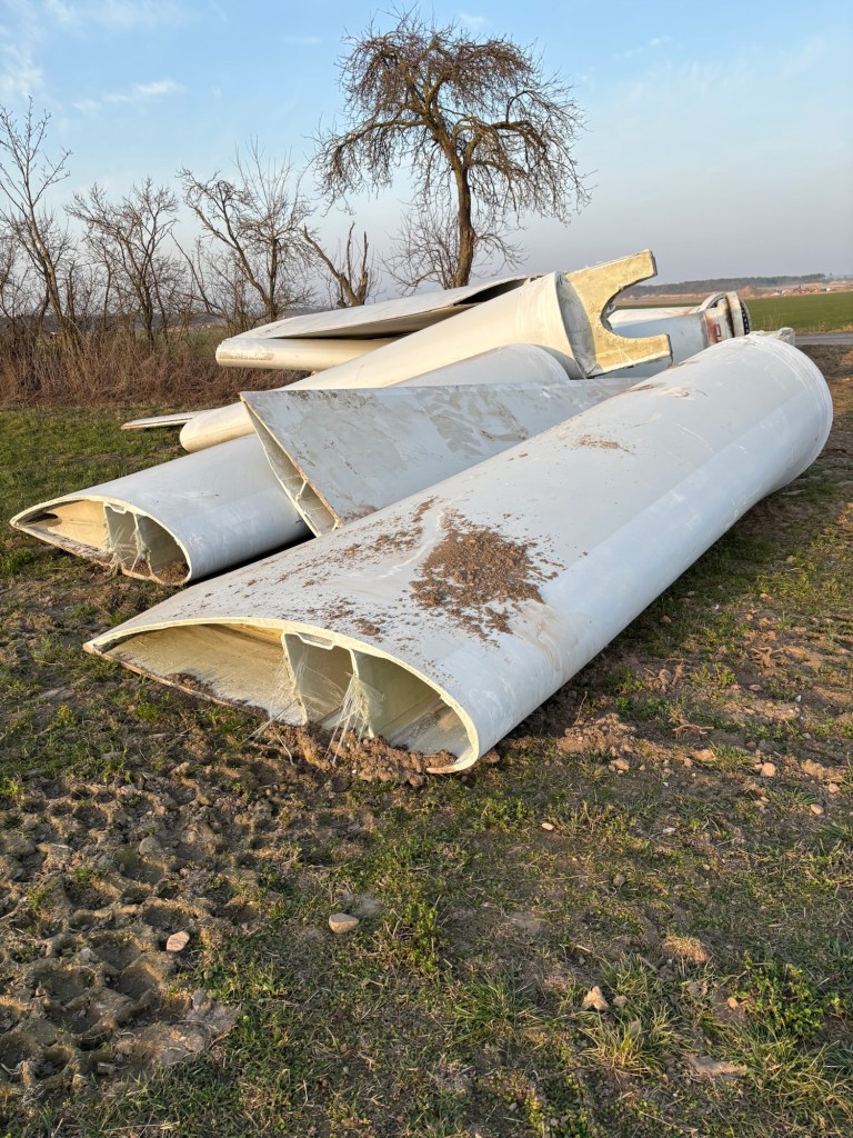 Die Rotorblätter wurden direkt vor Ort auf dem Acker zersägt und warten anscheinend auf den Abtransport.