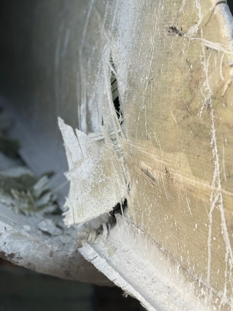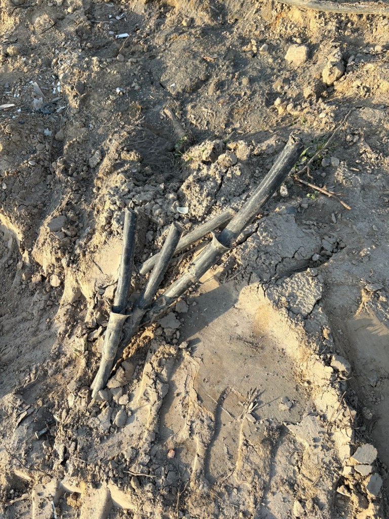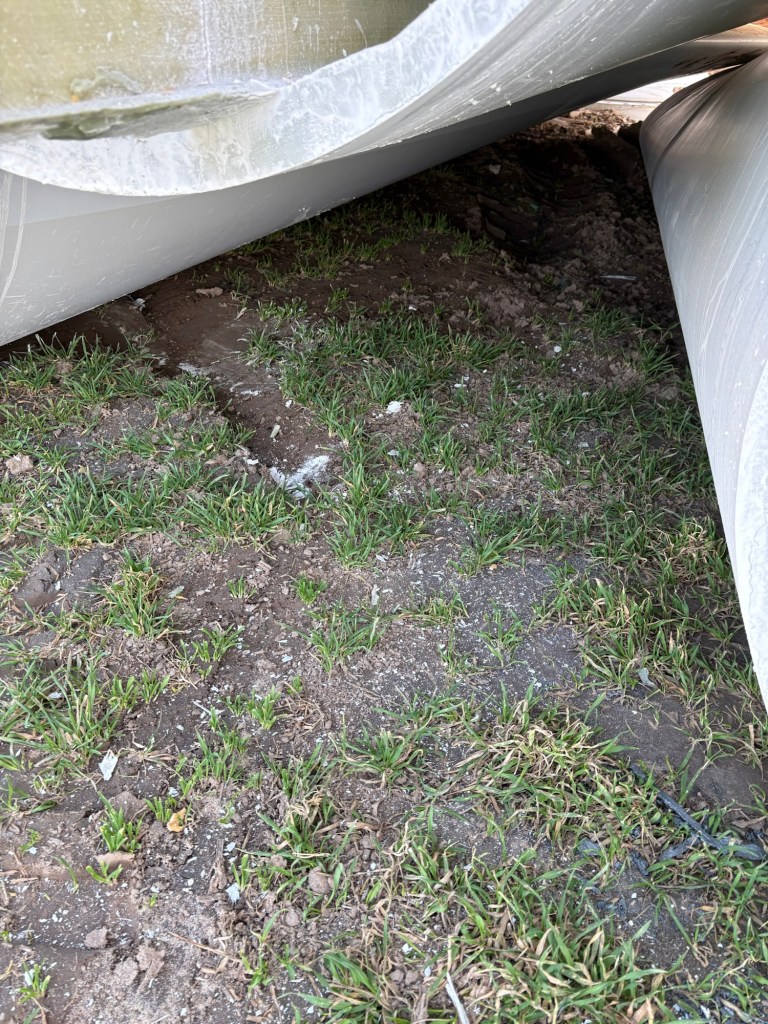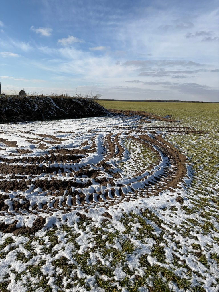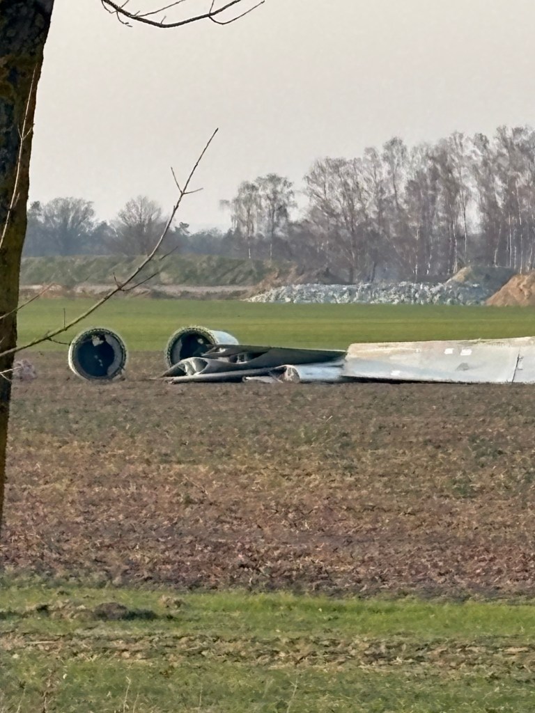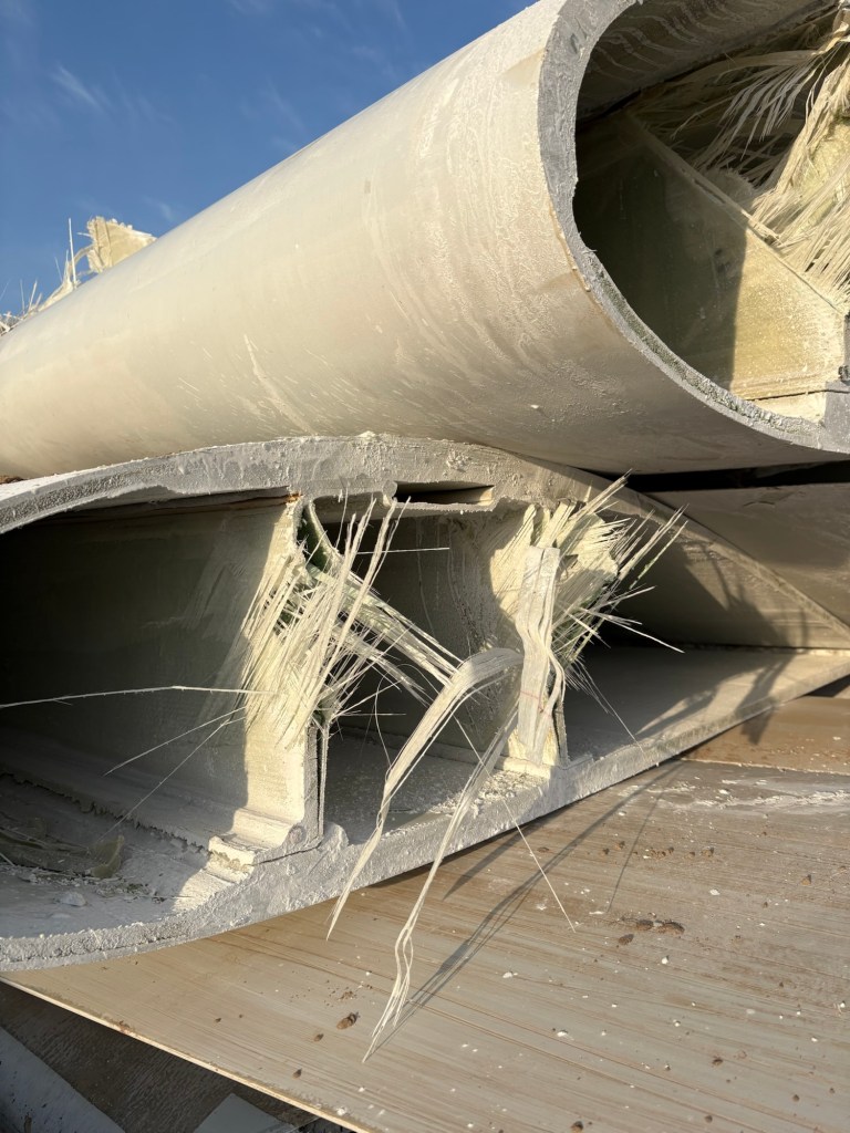 Die Rotorblätter wurden direkt vor Ort auf dem Acker zersägt und warten anscheinend auf den Abtransport.