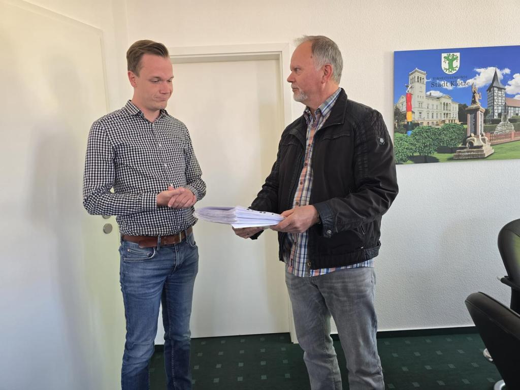 Innerhalb von nur 10 Tagen sammelten wir in der Einheitsgemeinde Klötze dazu 1.713 Unterschriften. Das waren über 20% der nötigen 10% der Einwohner! Diese übergaben wir am 12.05.25 dem Klötzer Bürgermeister Alexander Kleine.