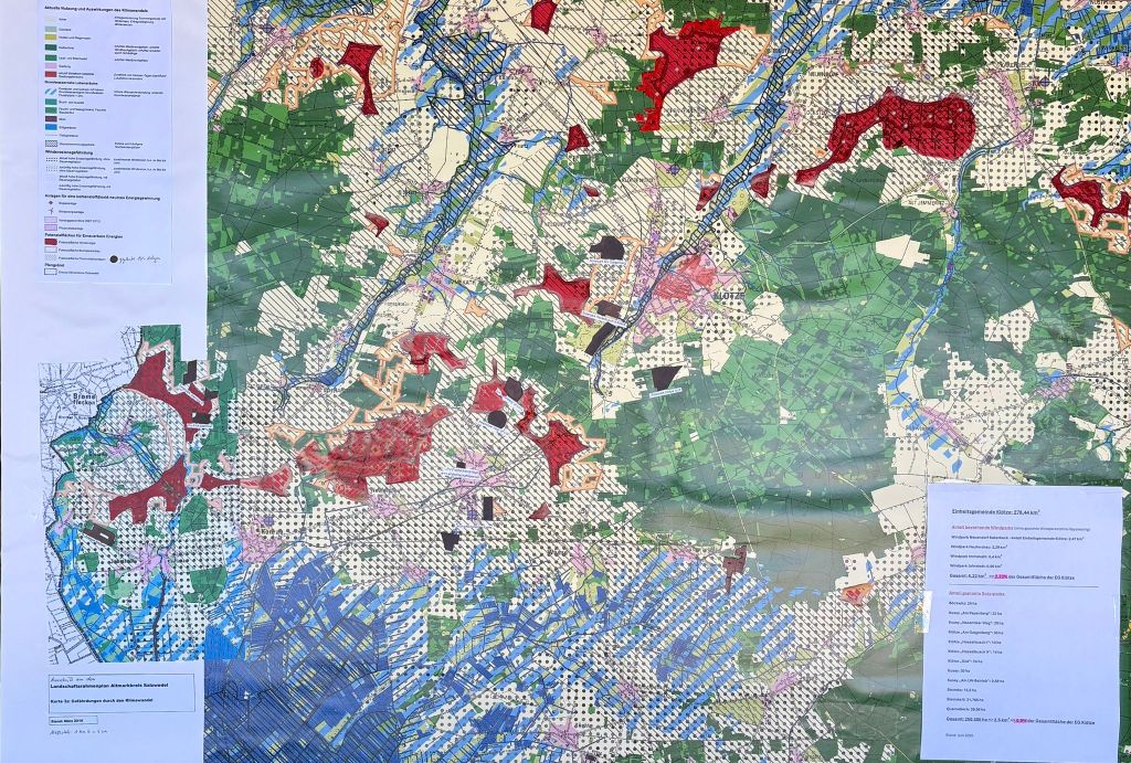 Außerdem veröffentlichten wir eine Karte der Einheitsgemeinde Klötze mit allen bestehenden oder geplanten Wind- und Solar“parks“ und den möglichen Flächen für Windenergie. Die Ausmaße sind erschreckend! Hier die Karte. Schwarz sind die Solarparks und rot bestehende, geplante und mögliche Windenergiegebiete. Die weissen Stecknadeln sind vorhandene und/oder geplante Windräder.